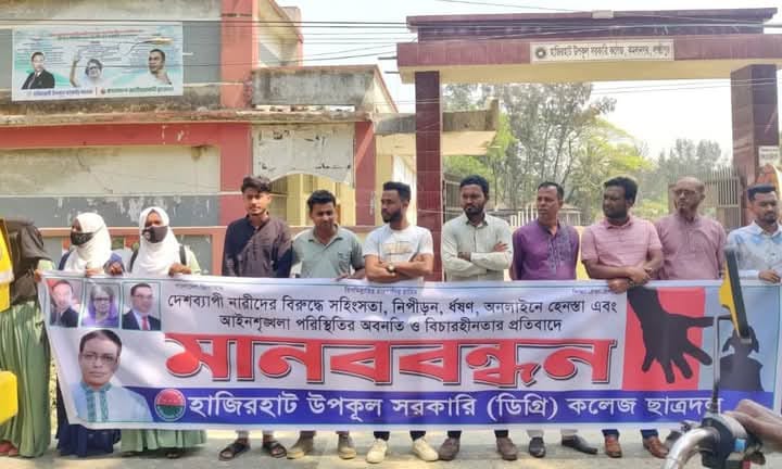 দেশব্যাপী সহিংসতা,নিপীড়ন,ধর্ষণ,অনলাইনে হেনস্তা এবং আইনশৃঙ্খলা পরিস্থিতির অবনতি ও বিচারহীনতার প্রতিবাদে লক্ষ্মীপুরের কমলনগর উপজেলার হাজিরহাট উপকূল সরকারি ডিগ্রি কলেজ শাখা ছাত্রদলের উদ্যোগে মানববন্ধন কর্মসূচি পালন করা হয়েছে।